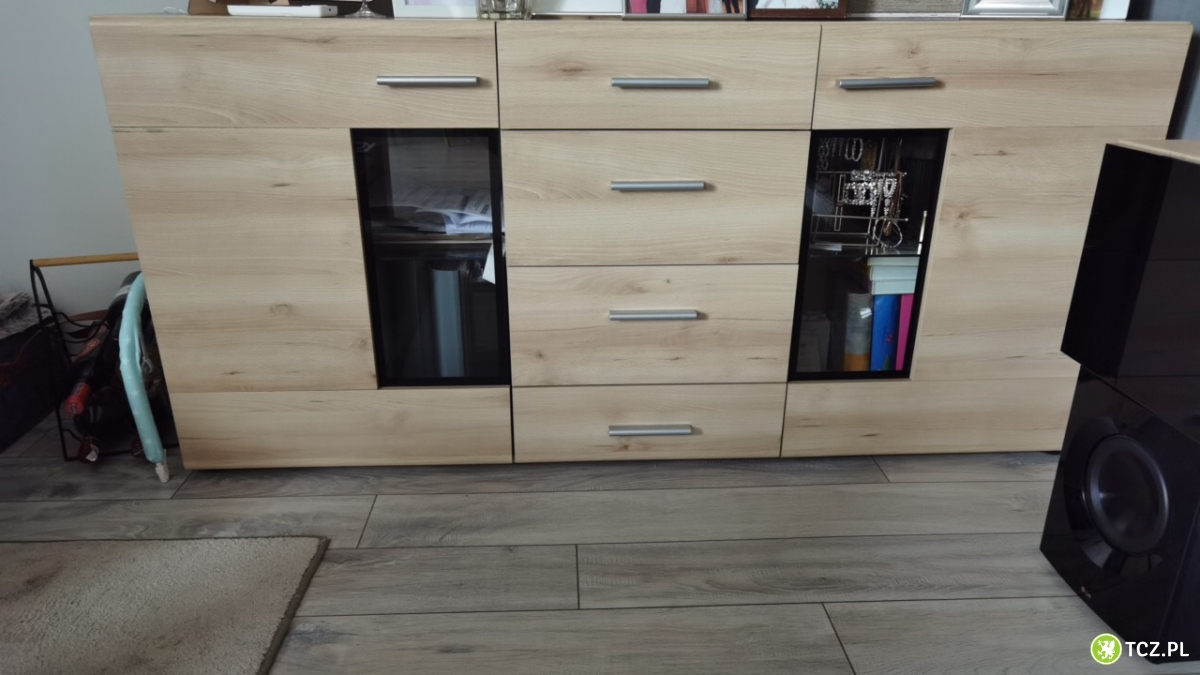 Witam sprzedam komodę, stan bardzo dobry, boczne drzwi otwierane z półka szklana, po środku szuflady. Kolor dąb sonoma. 8