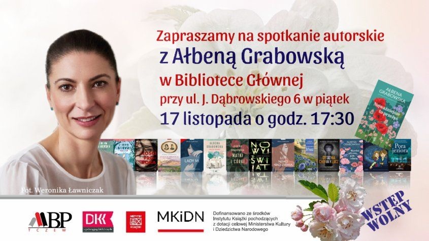 Dyskusyjny Klub Książki oraz Miejska Biblioteka Publiczna w Tczewie zapraszają na spotkanie z Ałbeną Grabowską, pisarką, autorką wielu popularnych książek, w tym zekranizowanej w postaci serialu sagi "Stulecie winnych", a na co dzień także pracującą w zawodzie lekarką.