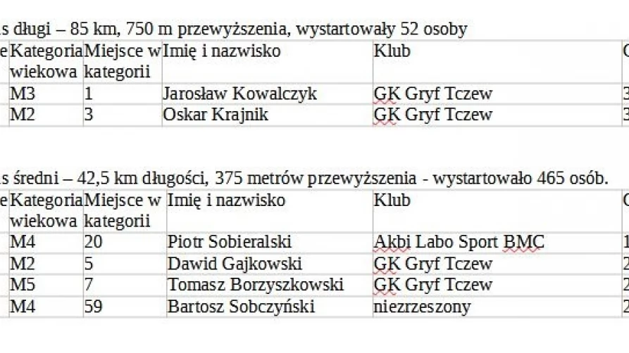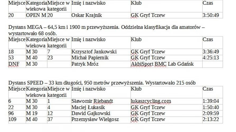 1. Wyniki lokalnych zawodników w wyścigu Maraton MTB Koronowo.