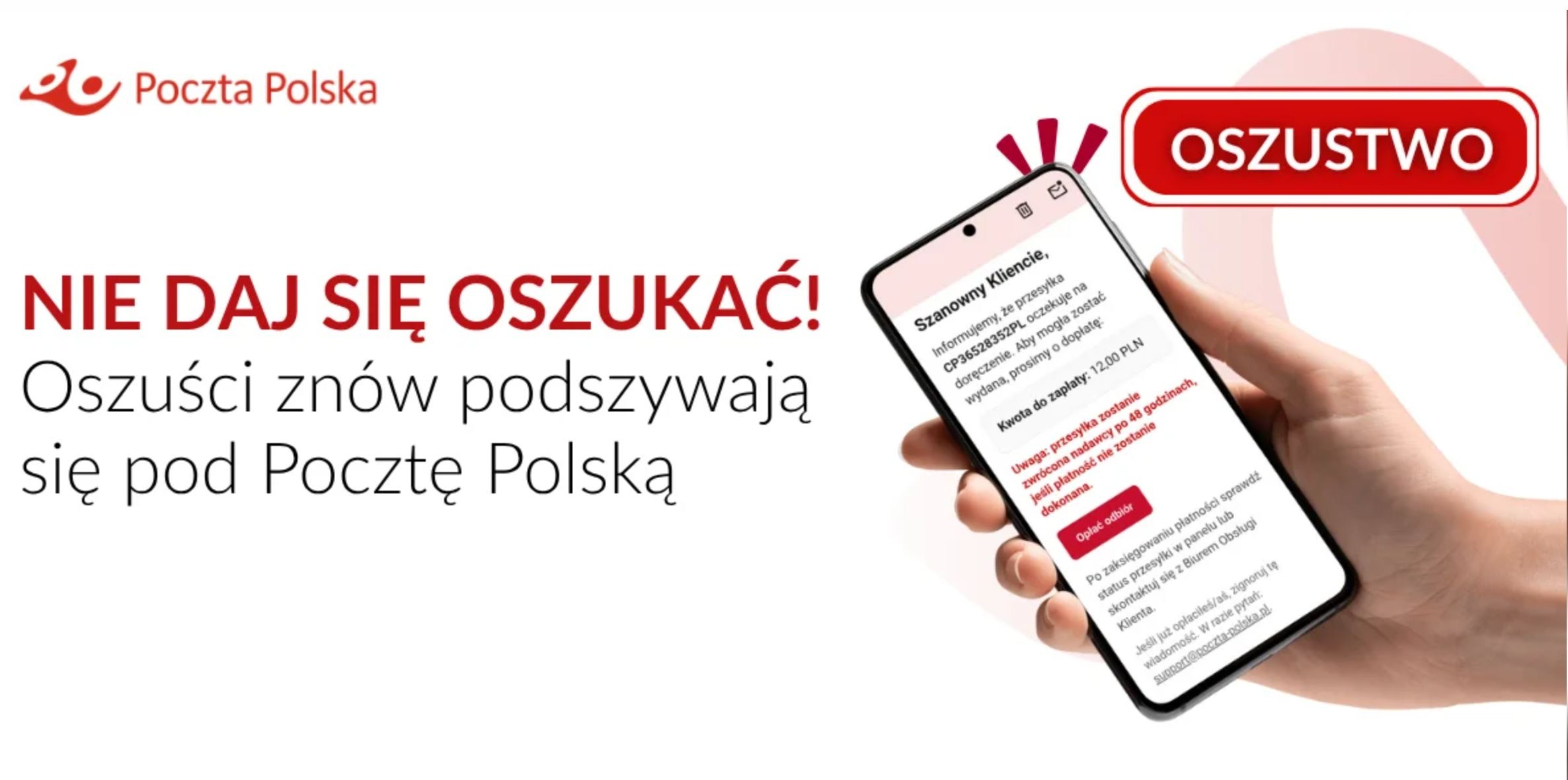 WAŻNE: Poczta Polska nigdy nie wysyła linków do pobierania etykiet przesyłek ani nie żąda opłat poprzez e-maile. Prawidłowy adres do śledzenia paczek to: www.pocztex.pl/sledzenie-przesylek lub emonitoring.poczta-polska.pl.