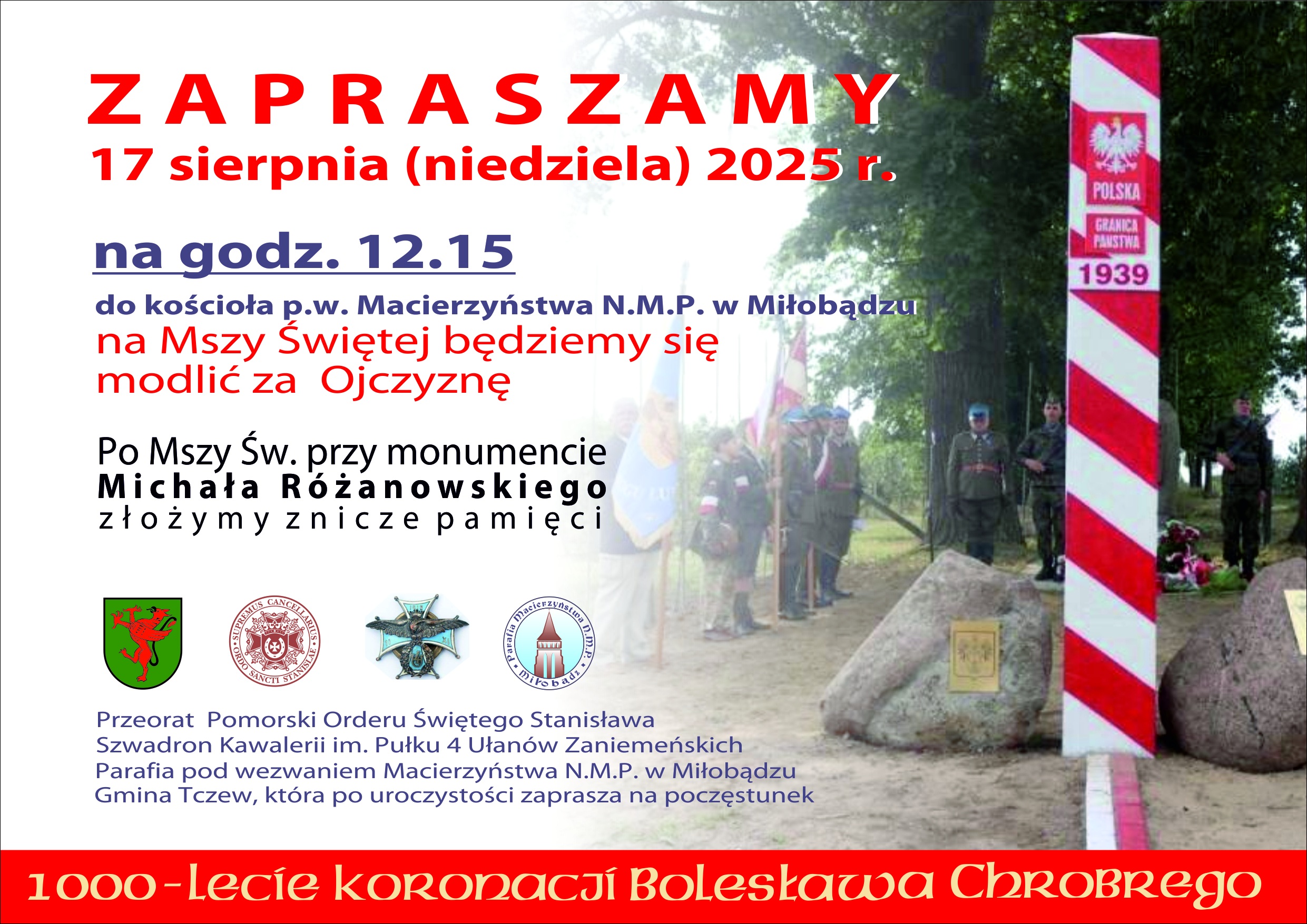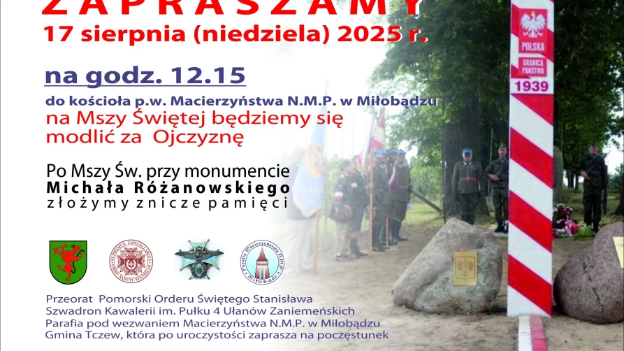17 sierpnia (niedziela) odbędą się uroczystości upamiętniające mord nad żołnierzem Wojska Polskiego - Michałem Różanowskim. O godzinie 12.00 rozpocznie się Msza Święta w intencji Ojczyzny w kościele pw. Macierzyństwa N.M.P. w Miłobądzu. - mówi Aleksandra Jahn, rzecznik prasowa Urzędu Gminy w Tczewie - Po Mszy Świętej, przy monumencie Michała Różanowskiego złożymy kwiaty i znicze pamięci.