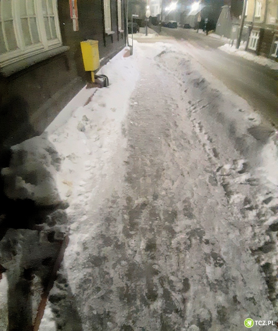 Chodniki na ulicy Jagiellońskiej są skute grubym lodem, zresztą w wielu miejscach w Tczewie można zostawić zęby na chodniku. Dziś widziałam piaskarkę, przejeżdżającą od strony shela, w kierunku Jagiellońskiej. Sypała tyle piasku , że trzeba byłoby go na kolanach z luoą szukać - żałosne.